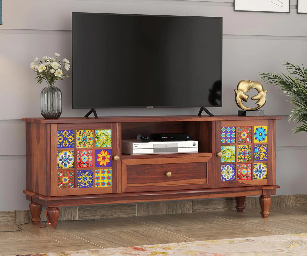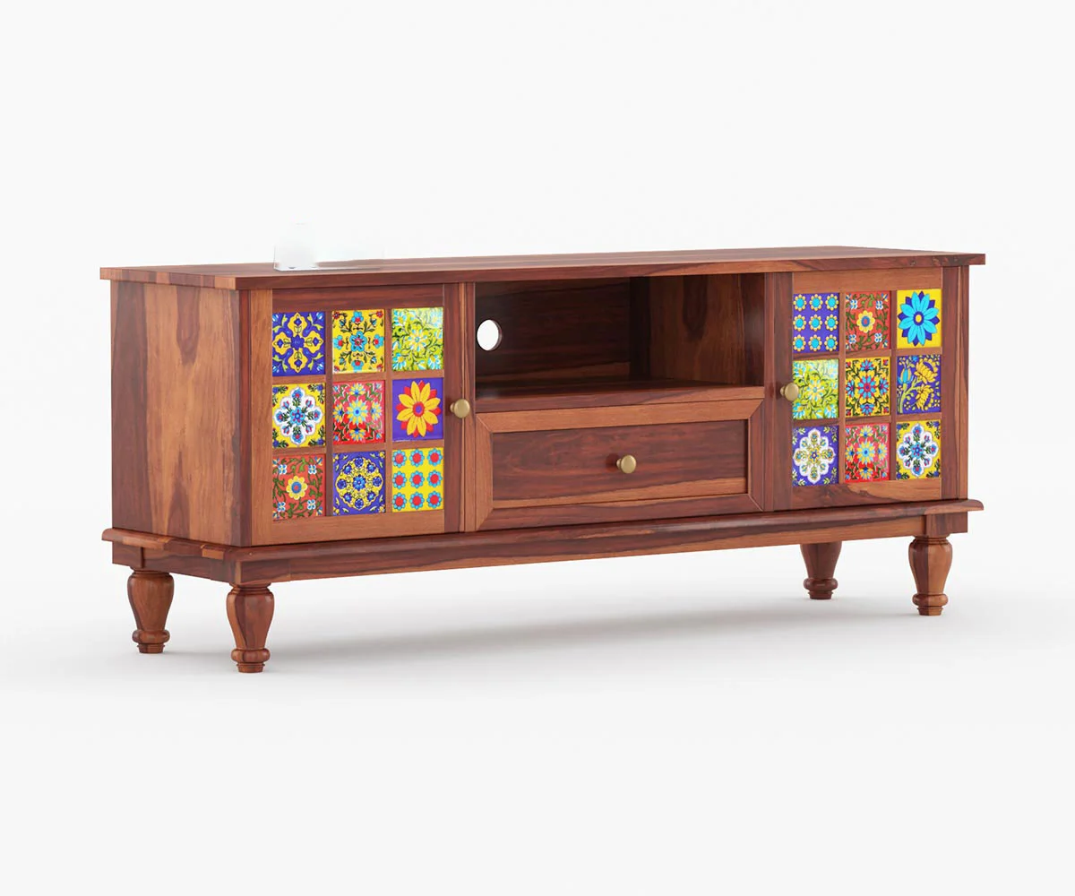Sheesham Wood Tv Cabinet with Tiles and Storage Heritage Artisan Essence (Honey finish)